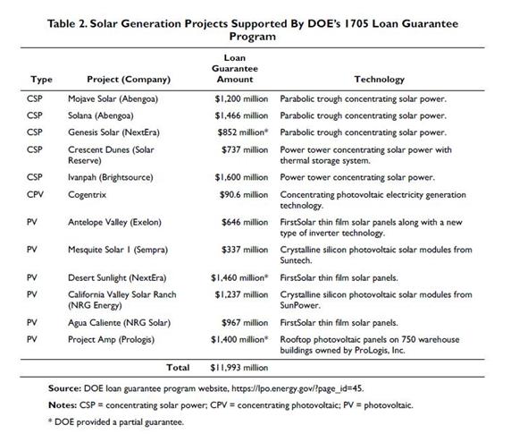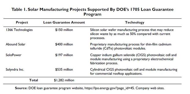 The nonpartisan Congressional Research Service conducted a review of the Department of Energy’s loan guarantee program to inform the ongoing House Energy and Commerce Oversight and Investigations Subcommittee’s review of the Solyndra case. The Department of Energy Loan Programs Office administers three loan programs, with Section 1705 designed “for certain renewable energy systems… that may have varying degrees (high or low) of technology risk” (CRS, 2011). It was a temporary program created by the American Recovery and Reinvestment Act and expired in September 2011. It amended the Energy Policy Act of 2005, a bill that first authorized DOE loan guarantees. Of the $16.5 billion in Section 1705 loan guarantees, approximately 82% were directed to solar projects (CRS, 2011). Those projects were defined as either solar manufacturing – like Solyndra; or solar generation.